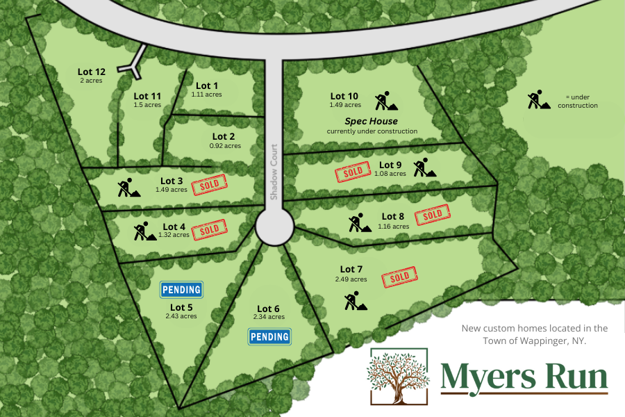 Myer’s Run is a 12 Lot Custom Private Home Community located in the Town of Wappingers Falls, New York, just two hours north of New York City. From the moment you drive up to the entrance of the subdivision you will realize this is the place to have your dream home for you and your family.